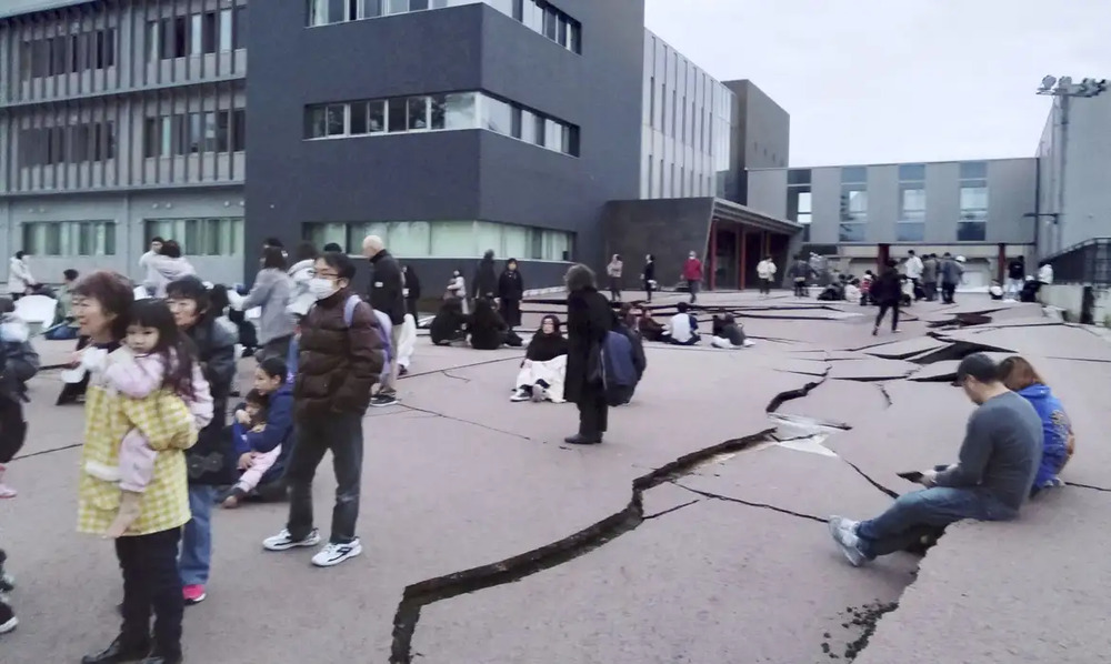 Imagens veiculadas pela mídia local mostraram um prédio desabando em meio a uma nuvem de poeira na cidade costeira de Suzu e uma enorme rachadura em uma estrada em Wajima, onde pais aparentemente aflitos seguravam seus filhos.