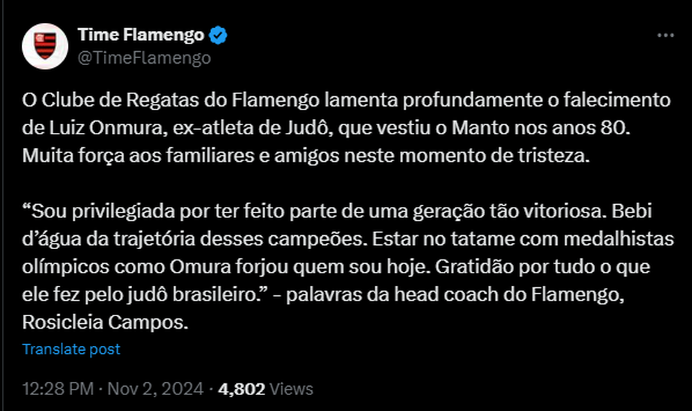 O Flamengo, um dos grandes clubes representados por Onmura, também prestou homenagem ao medalhista olímpico. em nota de pesar. Esportes.