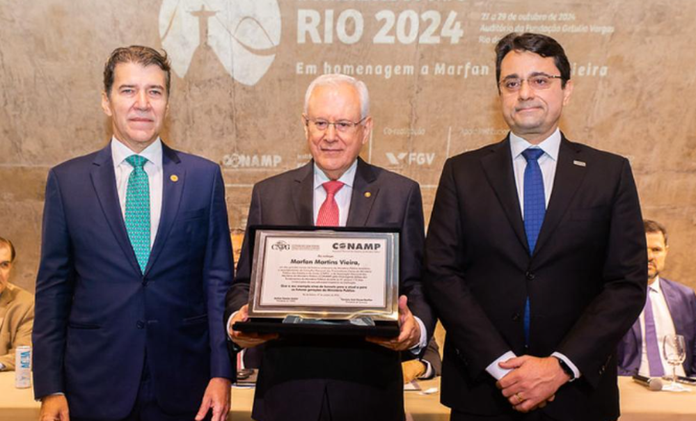 Um dos grandes nomes da história centenária do Ministério Público brasileiro, Marfan Martins Vieira foi homenageado nesta segunda-feira (28/10) durante o II Congresso do Conselho Nacional de Procuradores-Gerais (CNPG), no auditório da Fundação Getúlio Vargas, em Botafogo. A frase que abre o texto está inscrita na placa entregue a Marfan, ex-procurador-geral de Justiça e atual secretário-geral de Relações Institucionais e Defesa de Prerrogativas do Ministério Público do Estado do Rio de Janeiro (MPRJ). Estiveram no evento o governador do Estado, procuradores-gerais de Justiça, ministros do Supremo (STF) e do Superior Tribunal de Justiça (STJ), integrantes do legislativo, entre outras autoridades e amigos.