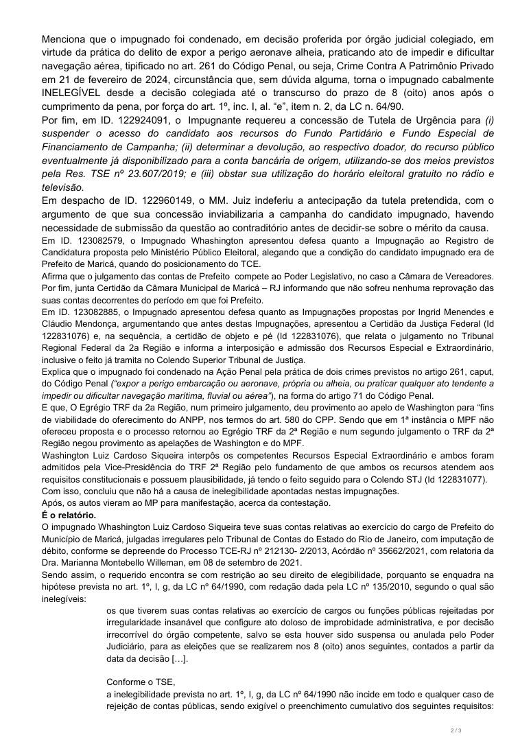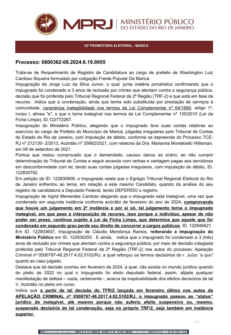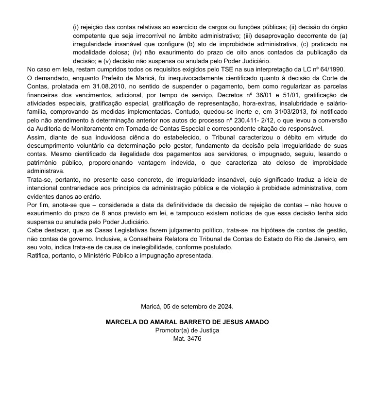 Há também um pedido de impugnação da candidatura a vereador de Adelso Pereira, do Avante. De acordo com o MP, ele provocou dano ao erário quando exercia mandato em Maricá. O político, ainda segundo o órgão, pediu parcelamento do débito ao TCE, mas não cumpriu o acordo e ficou impedido de disputar cargos públicos por oito anos.