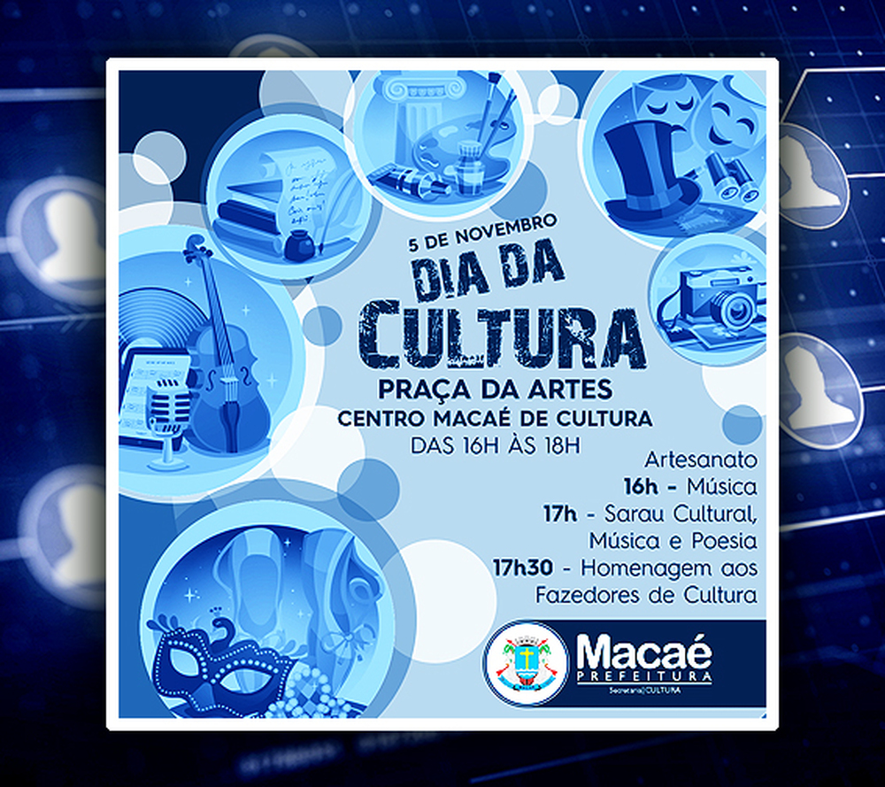 Música, poesia, homenagens e artesanato estão na programação comemorativa do ‘Dia Nacional da Cultura’, 5 de novembro. A Prefeitura, por meio da Secretaria de Cultura, promoverá as atividades no Centro Macaé de Cultura, av. Rui Barbosa, 780, Centro da cidade, em frente ao Teatro Municipal de Macaé, das 16h às 18h.