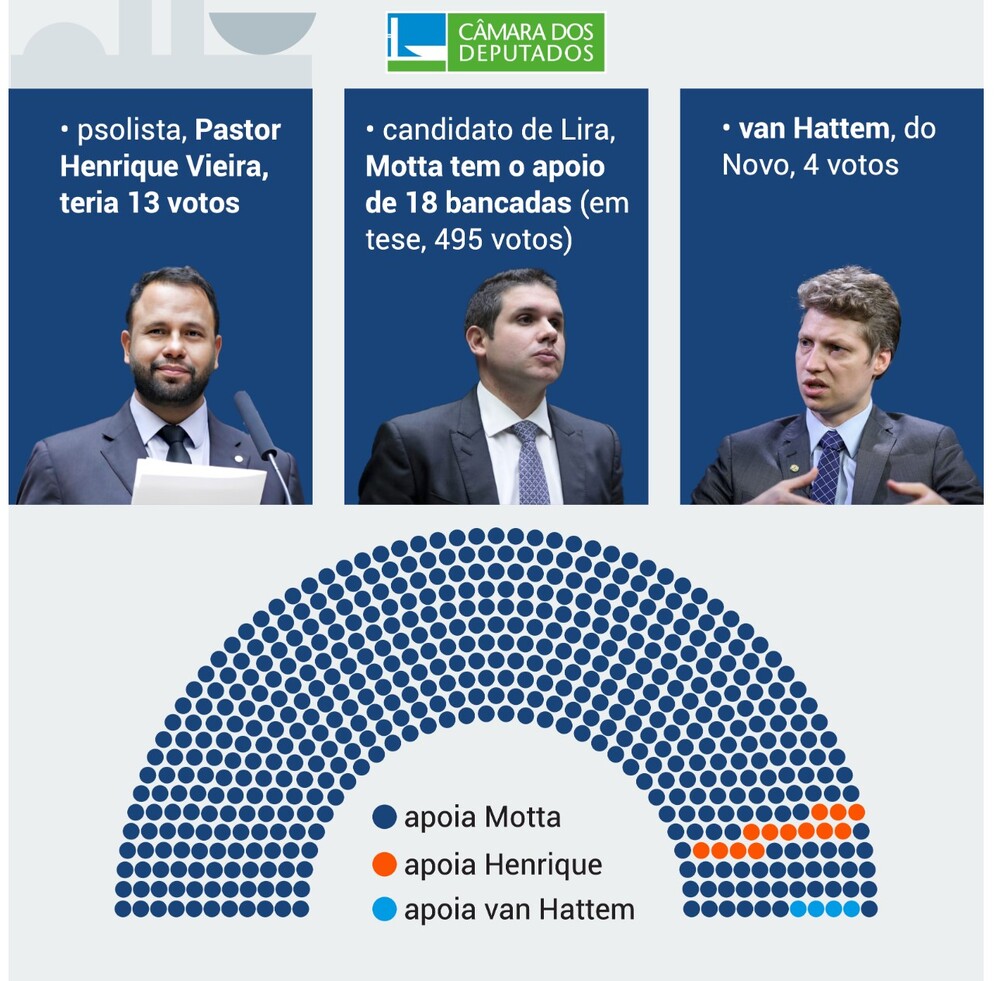 Motta é apoiado por 18 partidos, inclusive pelo PP do atual presidente Arthur Lira (AL). A candidatura era tida como única até os últimos dias de novembro, quando o Psol lançou o nome de Henrique Vieira para concorrer. Também em oposição ao atual presidente da Câmara, o Novo lançou van Hattem na 2ª feira (27.jan), a 5 dias do pleito. A legenda era a única que não havia declarado apoio a nenhum candidato.