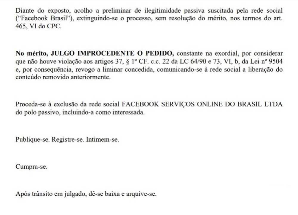 “As afirmativas postadas pela candidata constam em outras páginas eletrônicas e, muito embora, possua teor pejorativo, não ultrapassa o limite das críticas severas, que podem fazer parte da vida dos candidatos aos cargos públicos. No mérito, entendo que os pedidos constantes na inicial não merecem ser acolhidos”, diz a sentença.