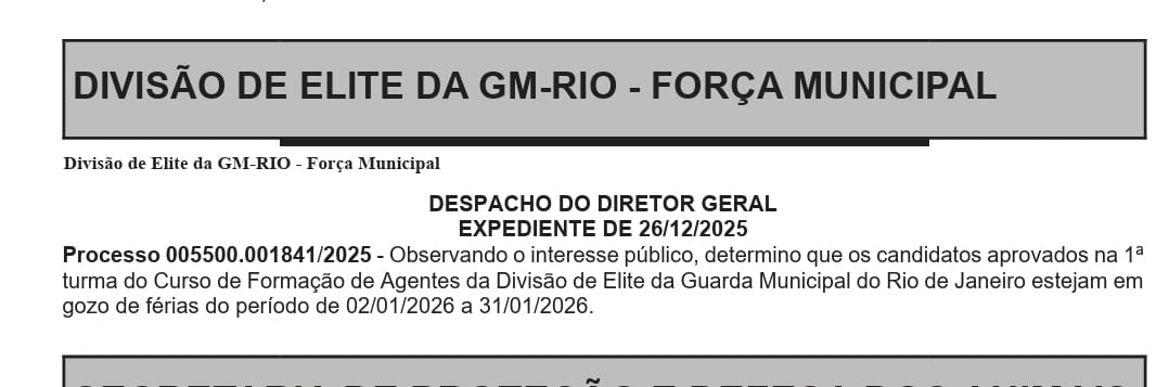 A primeira turma da Divisão de Elite, composta por 282 guardas municipais rigorosamente treinados, permanece em inatividade forçada desde dezembro de 2025. Conforme revelam os documentos oficiais analisados, o Despacho do Diretor Geral nº 005500.001841/2025, datado de 26 de dezembro de 2025, formalizou o período de férias coletivas de 02 de janeiro a 31 de janeiro de 2026, perpetuando a paralisia operacional.