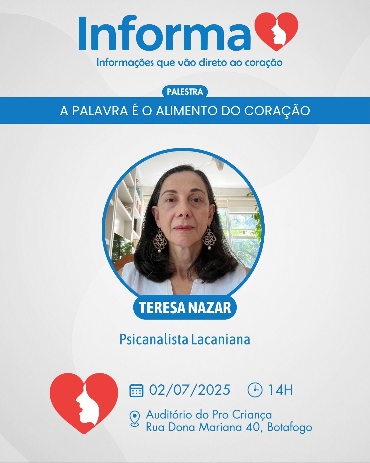 Projeto Informa Coração promove terceira edição com a psicanalista Teresa Nazar no dia 02 de julho, às 14h