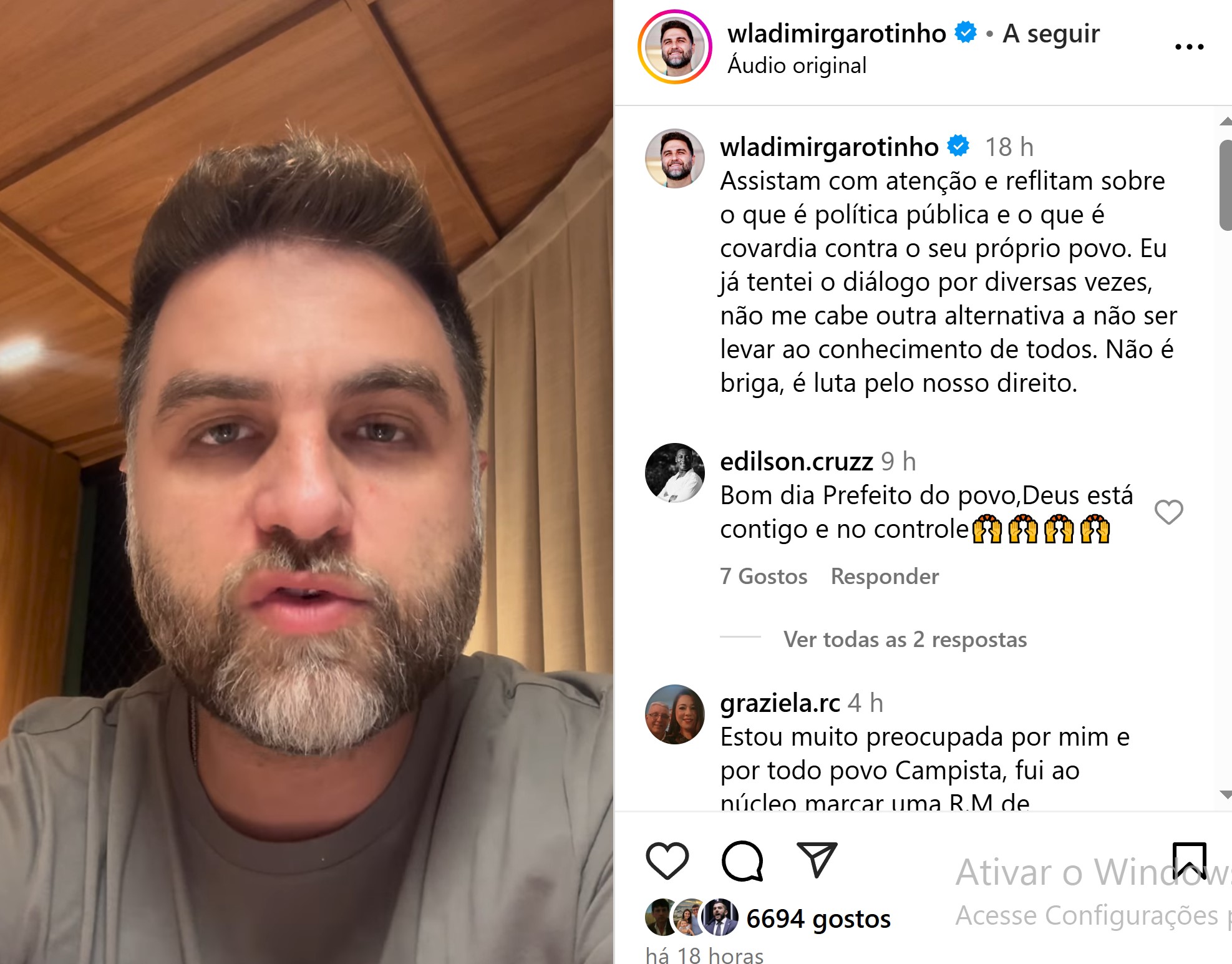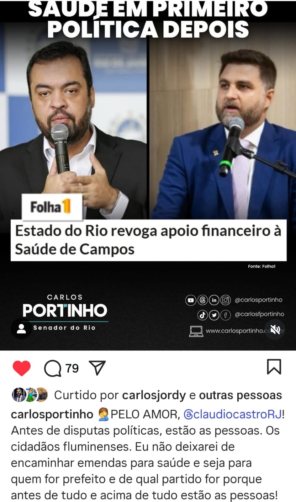 O prefeito de Campos dos Goytacazes, Wladimir Garotinho, gravou vídeo nas redes sociais citando o governador interino, deputado Rodrigo Bacellar, sobre os efeitos do cancelado do cofinanciamento estadual da saúde de Campos dos Goytacazes, que é de responsabilidade do governo federal, estadual e municipal e que vincula recursos da seguridade social para o financiamento de ações e serviços de saúde, especialmente na Atenção Primária à Saúde.