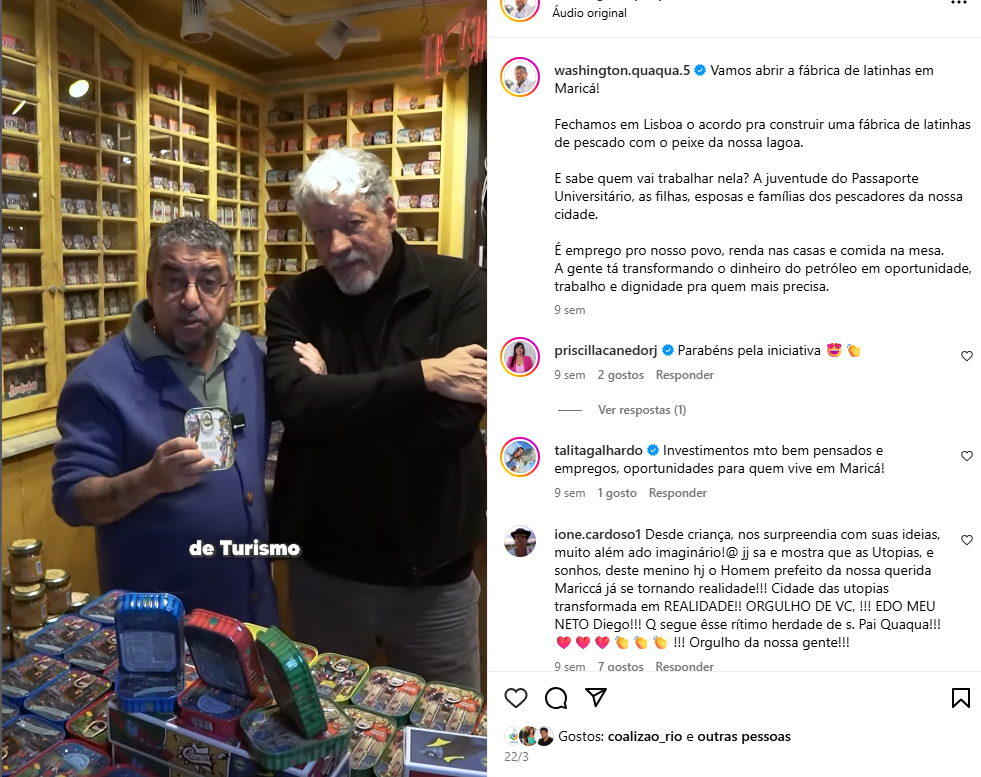 Graças as baboseiras que Quaquá vive falando nas redes sociais, para justificar suas viajes pelo mundo com sua nova esposa, coisas do tipo, que abrir fábrica de sardinhas (só se for em Cuba onde não tem sardinhas, mas abriu um monte de empresas).