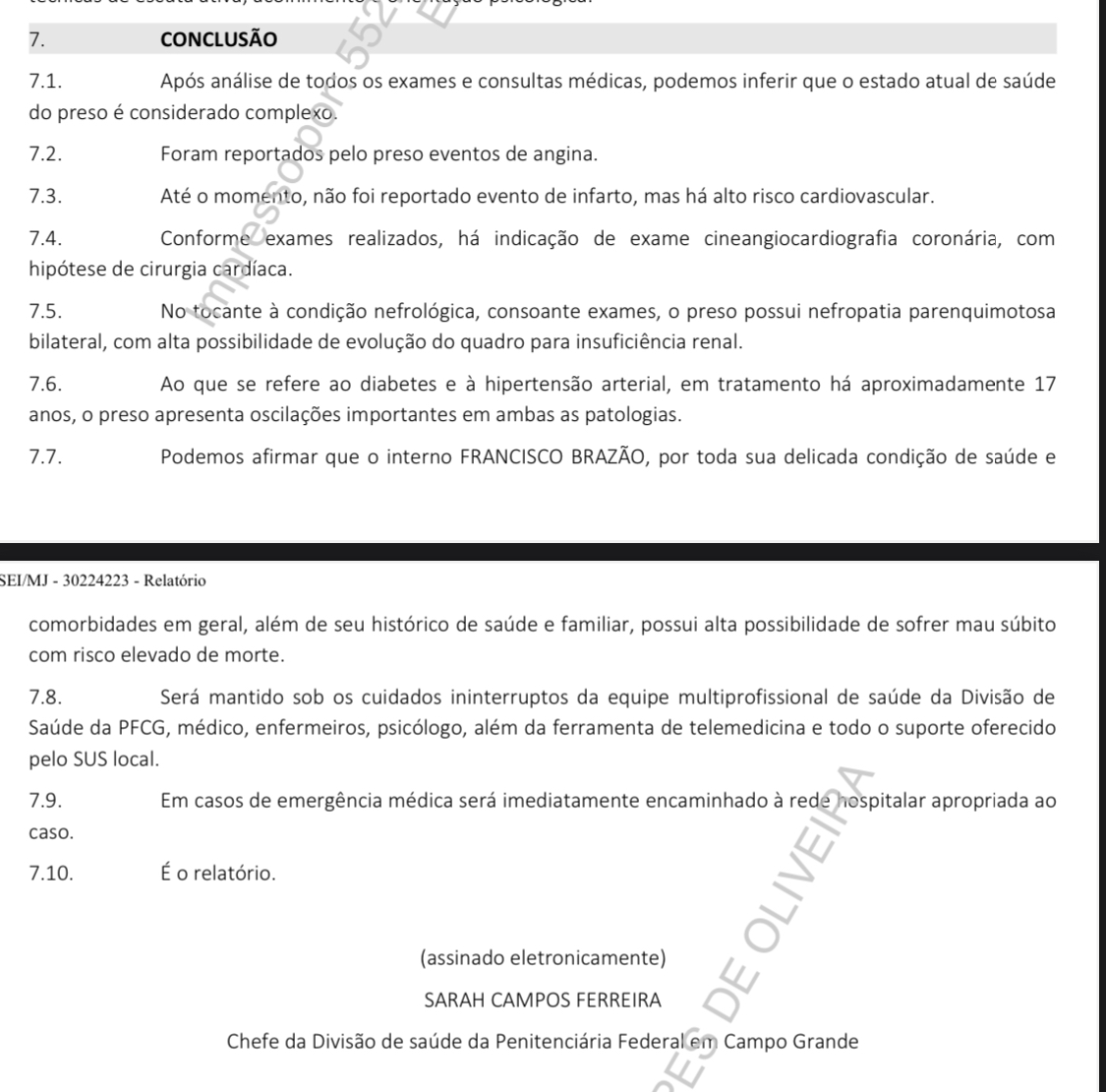 Apesar dos cuidados contínuos da equipe multiprofissional de saúde, conforme SEI/MJ - 30224223 - Relatório informa 'Podemos afirmar que o interno FRANCISCO BRAZÃO, por toda sua delicada condição de saúde E comorbidades em geral, além de seu histórico de saúde e familiar, possui alta possibilidade de sofrer mau súbito'.