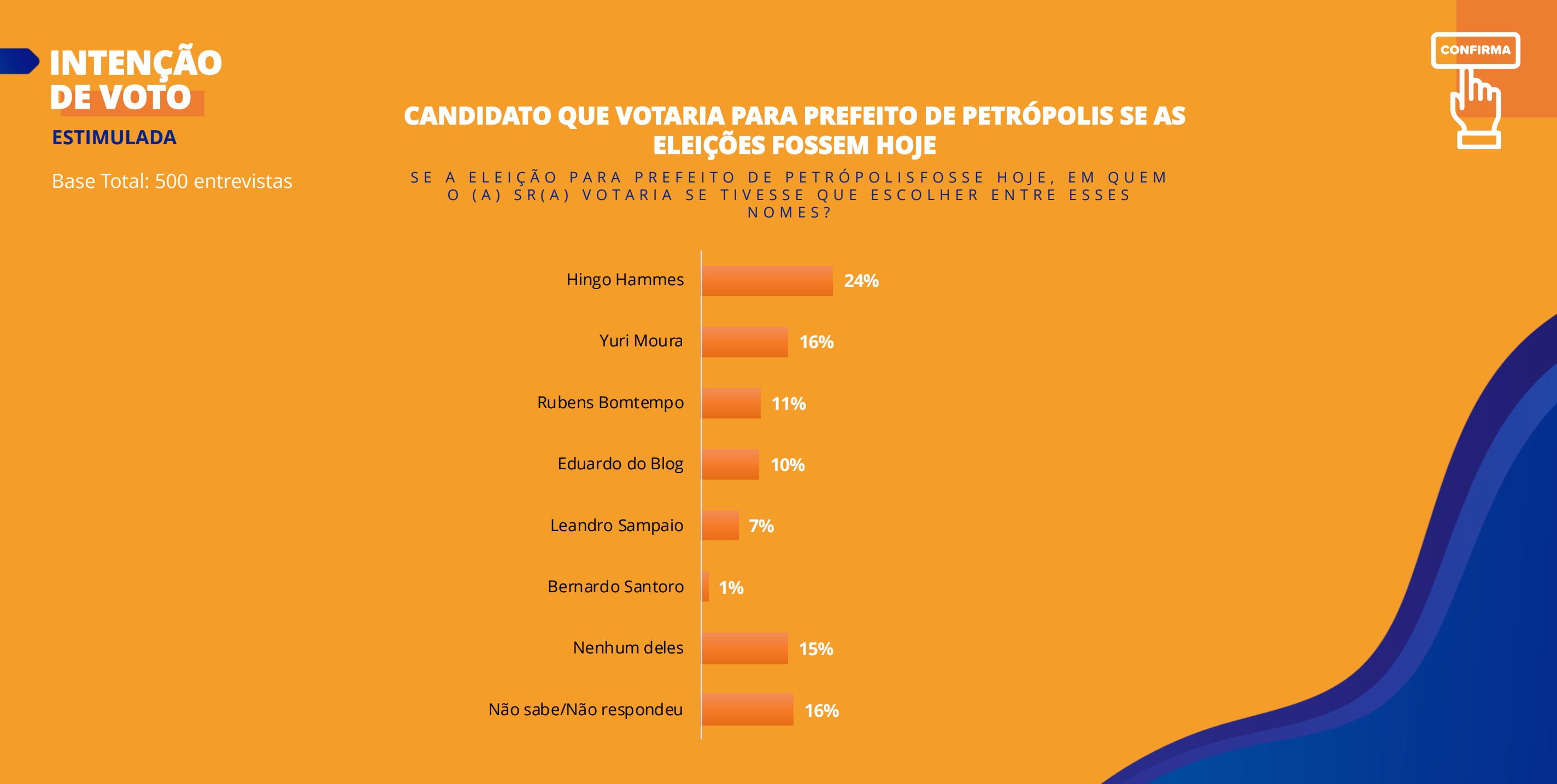 O cenário eleitoral de Petrópolis, a julgar pela primeira pesquisa de 2024 registrada na Justiça Eleitoral, divulgada nesta segunda-feira (05) pela GERP Empresa Brasileira de Pesquisa mostra o vereador Hingo Hammes (PP) na liderança da disputa pela prefeitura, com 24% das intenções de voto na pesquisa estimulada.