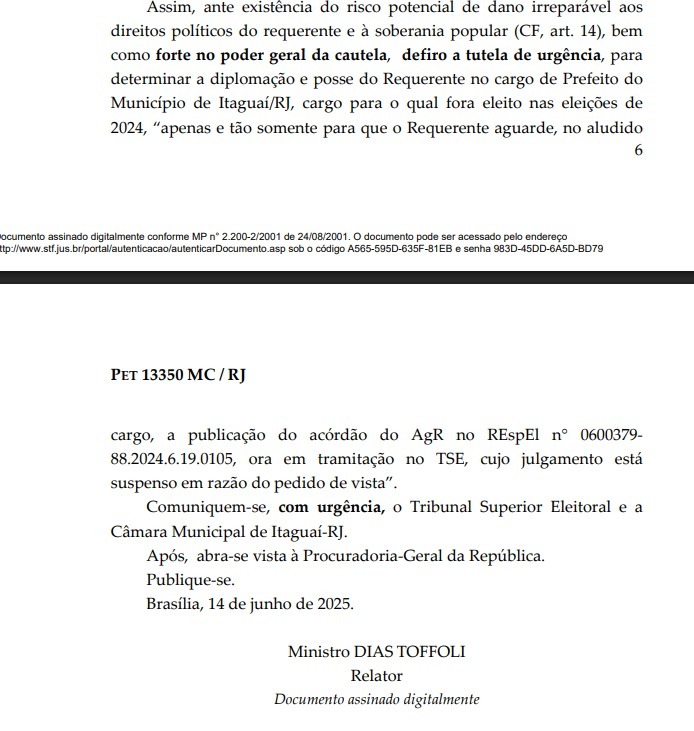 “Já estou pronto para retomar o trabalho em Itaguaí. Não podemos perder mais nem um segundo”. Foi assim que o prefeito Rubem Vieira recebeu a decisão do Supremo Tribunal Federal (STF), que o reconduz ao cargo para o qual foi eleito, em outubro, com 39% dos votos da cidade da região metropolitana do Rio de Janeiro. Em sentença assinada pelo ministro Dias Tofolli, no sábado (14/6), o STF determinou a diplomação imediata de Rubão, concedendo tutela de urgência para que ele exerça seu mandato enquanto aguarda o julgamento definitivo de um recurso no Tribunal Superior Eleitoral (TSE). Agora, o Tribunal Regional Eleitoral do Rio de Janeiro (TRE-RJ) e a Câmara Municipal de Itaguaí devem ser imediatamente comunicados para cumprir a ordem.