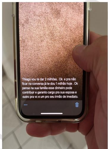 Além de naquele momento oferecer 100 mil reais e cargos para a família fundadora da sigla em trocas de votos para a eleição do partido que ocorreu em fevereiro passado, em tentativa frustrada, chegou posteriormente a oferecer 2 milhões de reais em mensagem de foto temporária, mas que precavido, o receptor a registou com outro aparelho.