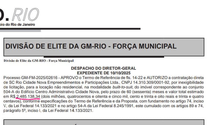 Divisão de Elite da GM-Rio aprova locação de R$ 2,4 milhões por 60 meses no Centro Administrativo Cidade Nova, enquanto município promove leilão de patrimônio público.