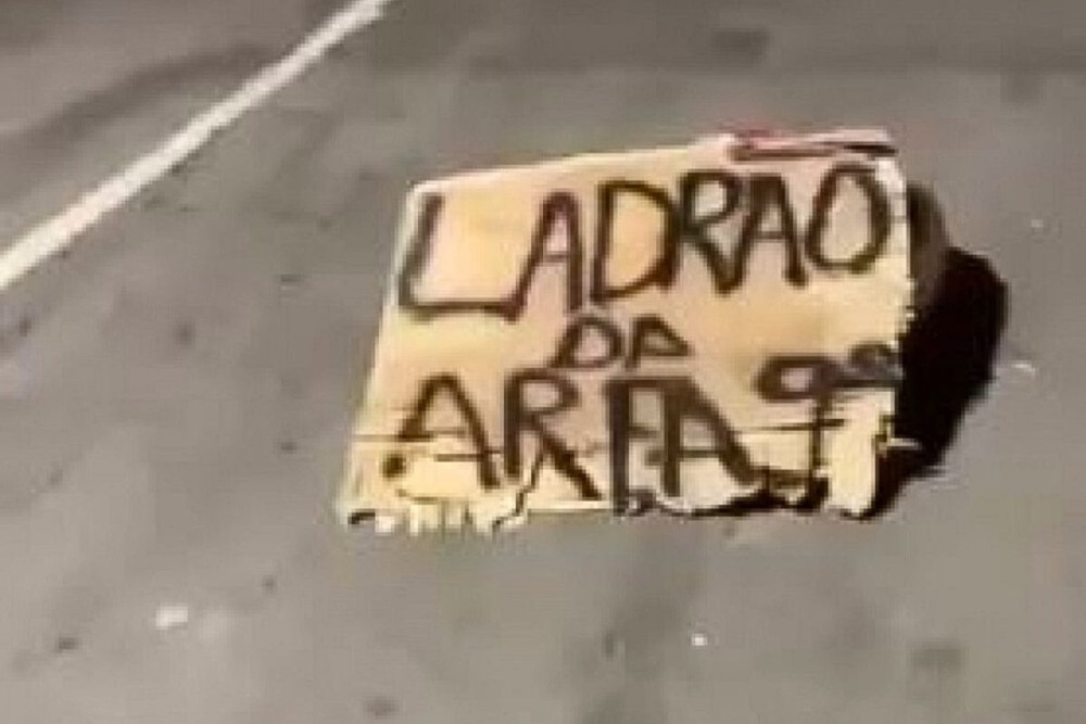 Imagens que circulam nas redes sociais mostram uma placa de papelão ao lado do corpo, com a mensagem “ladrão da área”.
