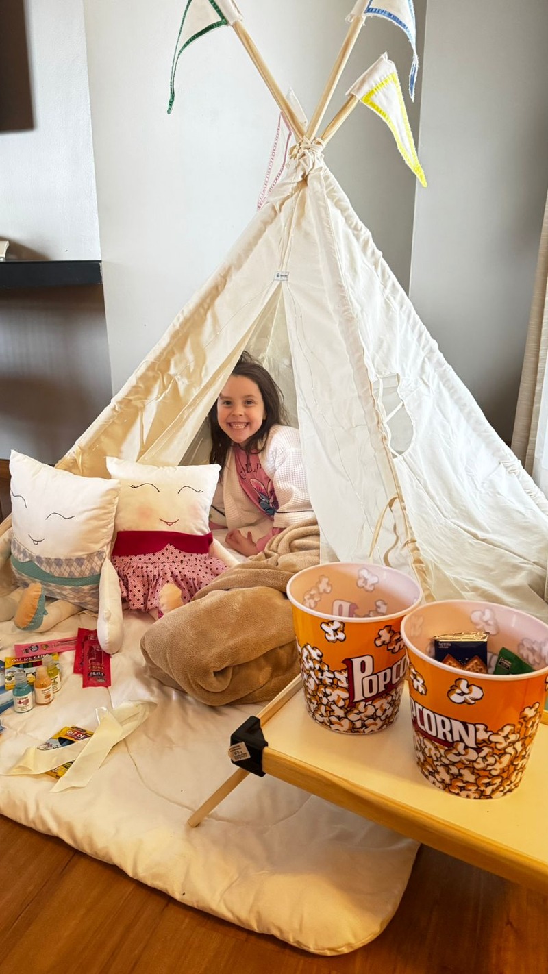 A Suíte Família, uma das opções mais amplas do hotel, dispõe de dois quartos, sala de estar, sala de jantar e uma copa equipada com cafeteira, chaleira, geladeira e micro-ondas. O espaço atende bem a famílias com crianças e permite maior autonomia durante a estadia.
