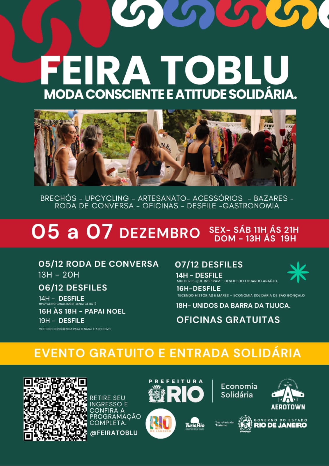 A Feira Toblu realiza, de 05 a 07 de dezembro de 2025, a 3ª edição do evento “Carnatal”, no shopping Aerotown, Barra da Tijuca — das 11h às 21h (sex e sáb) e 13h às 19h (dom). A entrada é gratuita, e o evento reforça seu compromisso social com a arrecadação de alimentos não perecíveis destinados à ONG Fazer o Bem Nos Faz Bem, além de apoiar mais quatro instituições, totalizando 5 ONGs beneficiadas.