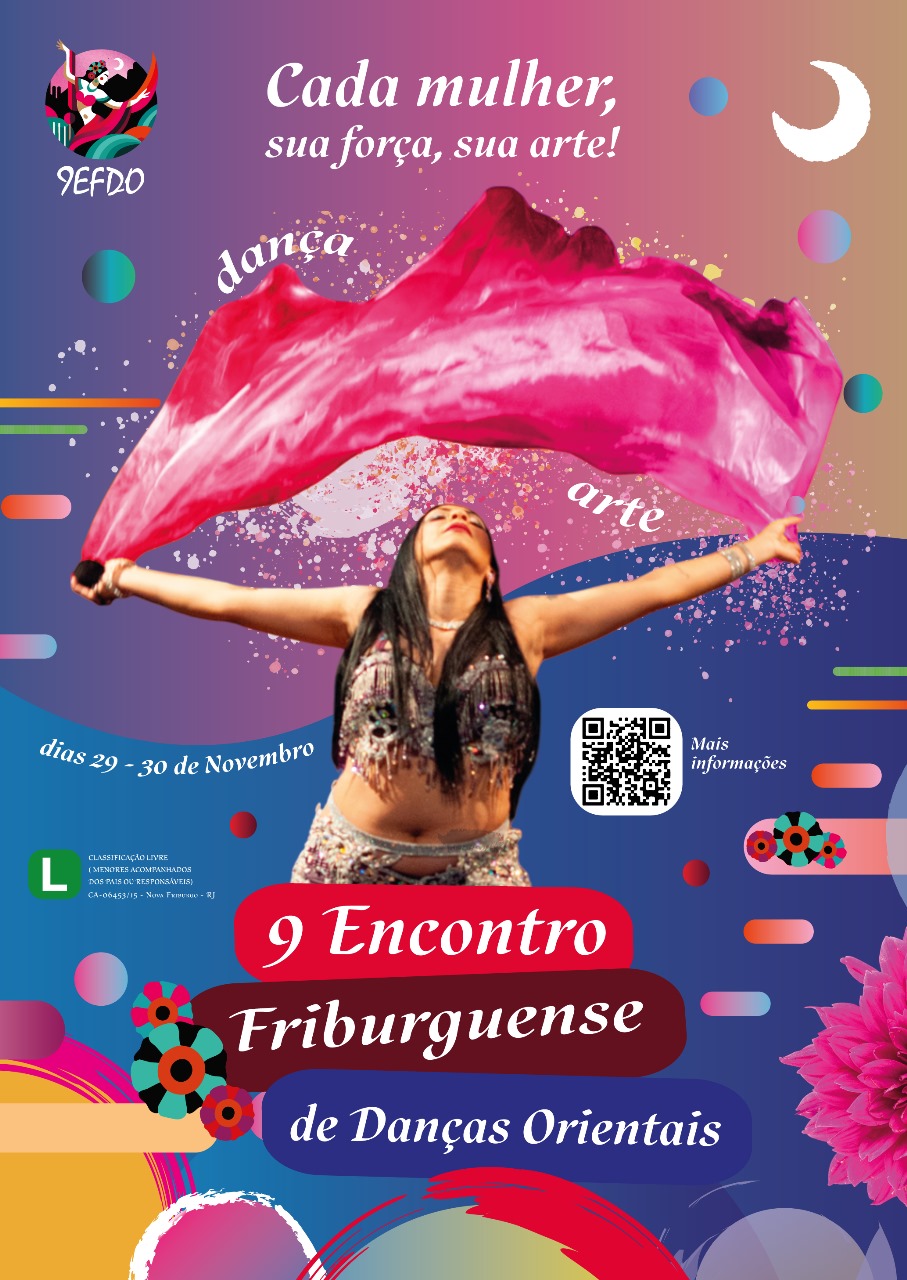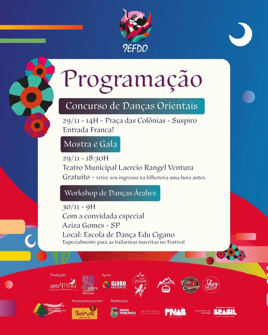O 9º Encontro Friburguense de Danças Orientais será realizado no dia 29 de novembro (sábado), na Praça das Colônias e no Teatro Municipal Laercio Rangel Ventura - Praça do Suspiro - centro de Nova Friburgo/RJ.