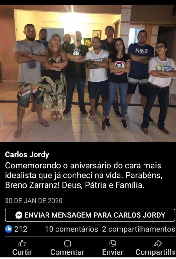 “Comemorando o aniversário do cara mais idealista que já conheci na vida. Parabéns, Breno Zarranz! Deus, Pátria e Família”, escreveu Jordy.