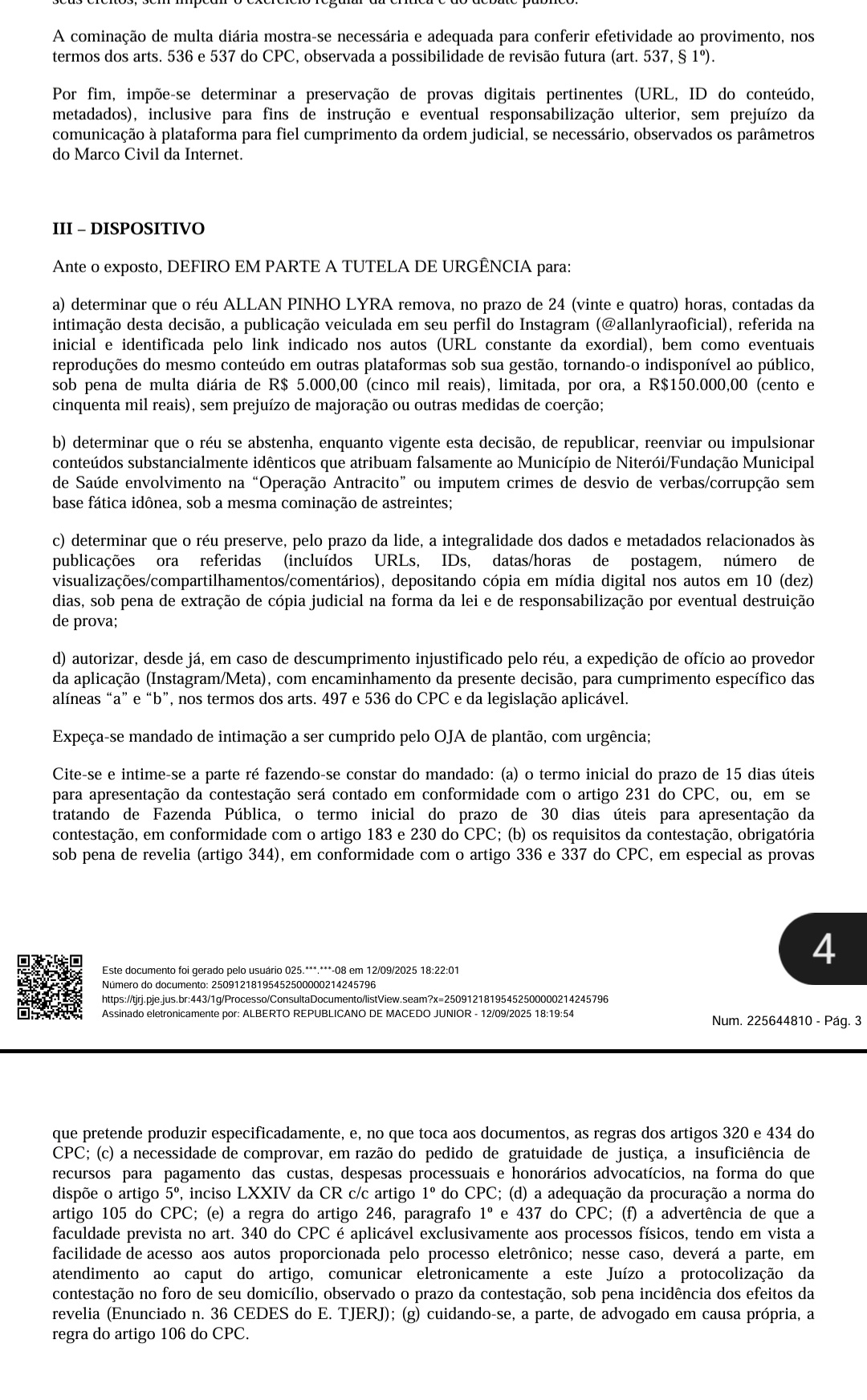 Na decisão, o juiz Alberto Republicano de Macedo Junior concedeu tutela de urgência determinando que o vereador remova a postagem no prazo de 24 horas, se abstenha de publicar novos conteúdos do mesmo teor, sob pena de multa diária de R$ 5 mil até R$ 150 mil. A Justiça também determinou que, em caso de descumprimento, a decisão seja encaminhada à plataforma Instagram/Meta para cumprimento direto da ordem judicial.