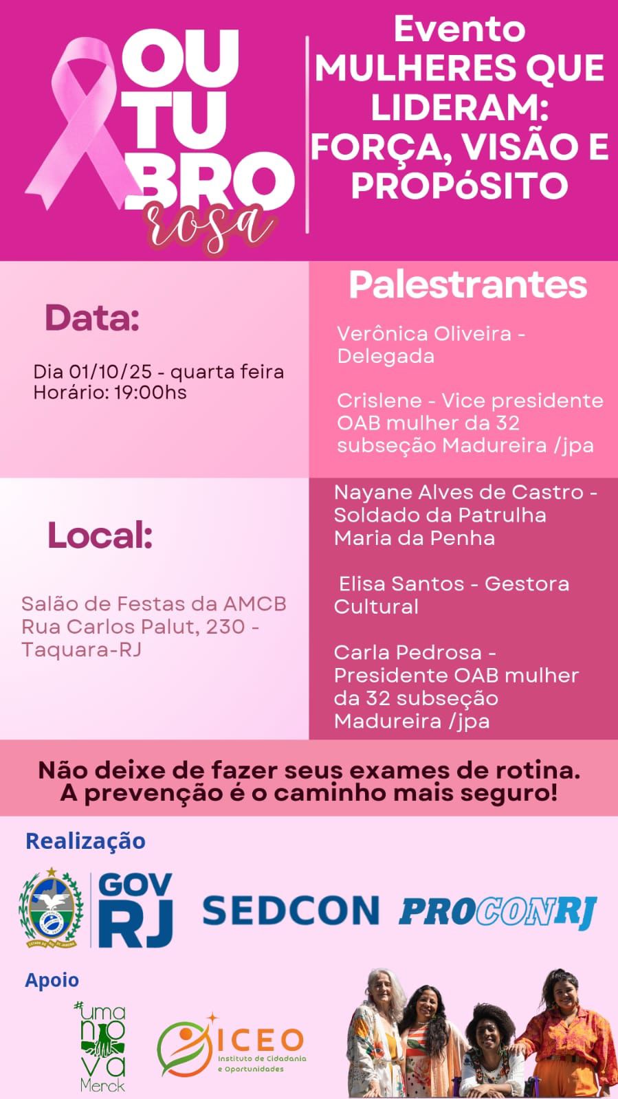 A programação integra a agenda do Outubro Rosa, reforçando a importância da prevenção e do diagnóstico precoce do câncer de mama. A mensagem central do encontro é clara: não deixar de realizar os exames de rotina, já que a prevenção continua sendo o caminho mais seguro.