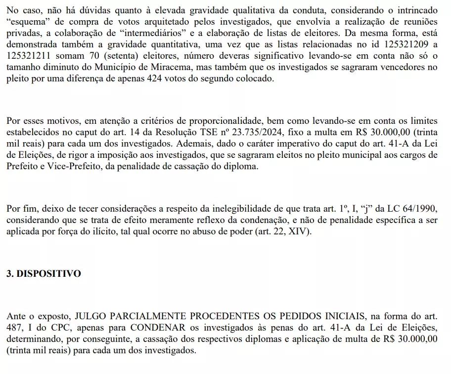 A multa de R$ 30 mil aplicada a cada um dos cassados pode parecer módica diante da gravidade do delito, mas representa apenas a ponta do iceberg das consequências. A cassação do diploma implica na perda imediata do mandato, na inelegibilidade por oito anos (conforme Lei Complementar nº 64/90) e na possibilidade de responsabilização criminal por corrupção eleitoral, prevista no artigo 299 do Código Eleitoral.