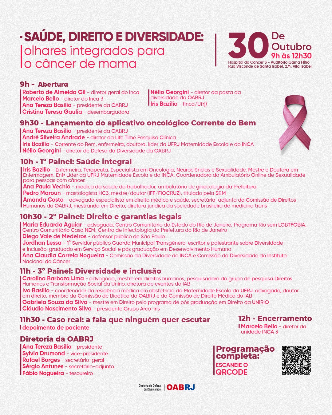 Inscrições: Até 30/10 pelo site: https://www.gov.br/inca/pt-br/assuntos/eventos/saude-direito-e-diversidade-olhares-integrados-para-o-cancer-de-mama-1
