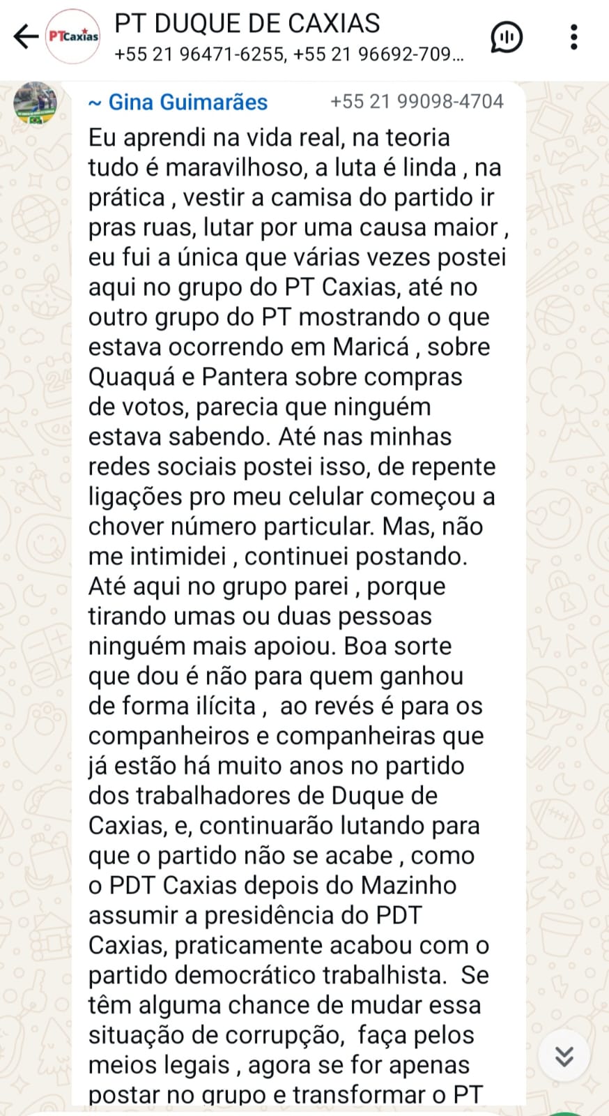 "...eu fui a única que várias vezes postei aqui no grupo do PT Caxias, até no outro grupo do PT mostrando o que estava ocorrendo em Maricá , sobre Quaquá e Pantera sobre compras de votos, parecia que ninguém estava sabendo. Até nas minhas redes sociais postei isso, de repente ligações pro meu celular começou a chover número particular. Mas, não me intimidei , continuei postando...", escreveu a filiada do PT Caxias.