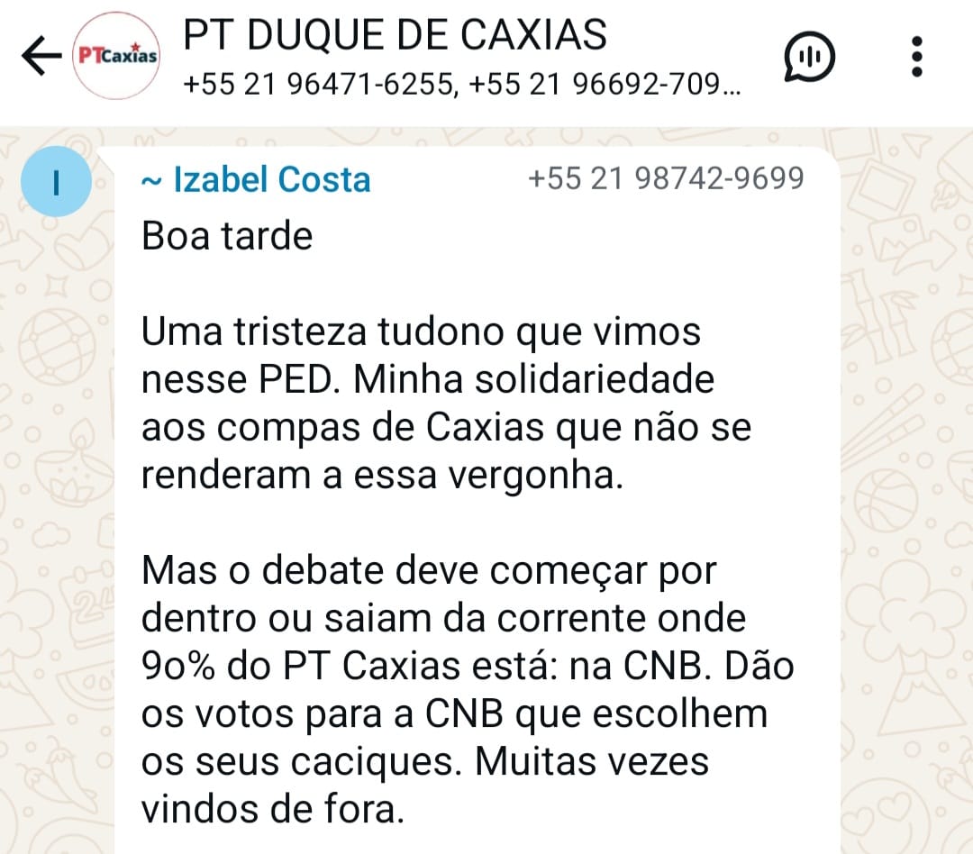 Outra filiada local, Izabel Costa, criticou duramente a corrente CNB Favela (de Quaquá). "Uma tristeza tudo o que vimos nesse PED. Minha solidariedade aos compas de Caxias que não se renderam a essa vergonha. Mas o debate deve começar por dentro ou saiam da corrente onde 90% do PT Caxias está: na CNB. Dão os votos para a CNB que escolhem os seus caciques. Muitas vezes vindos de fora", disse ela.