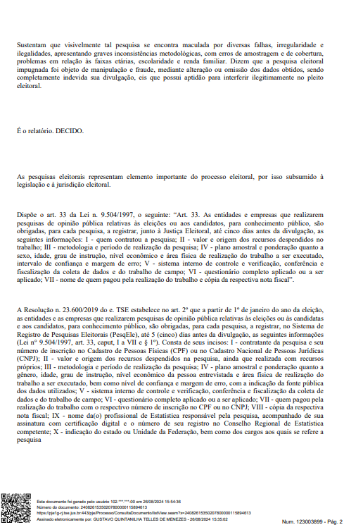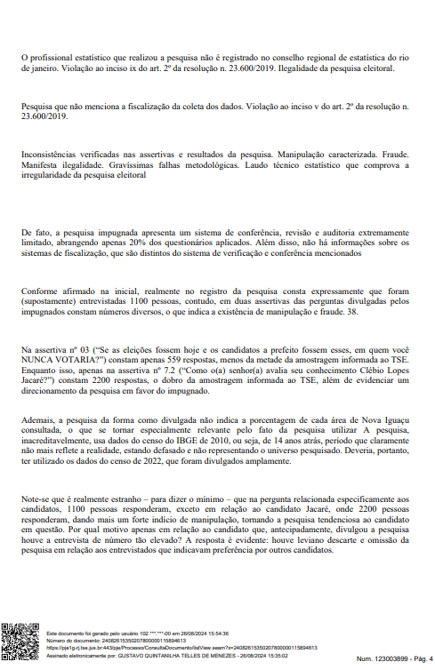 “Note-se que é realmente estranho – para dizer o mínimo – que na pergunta relacionada especificamente aos candidatos, 1100 pessoas responderam, exceto em relação ao candidato Jacaré, onde 2200 pessoas responderam, dando mais um forte indício de manipulação, tornando a pesquisa tendenciosa ao candidato em questão”, diz um trecho da decisão.