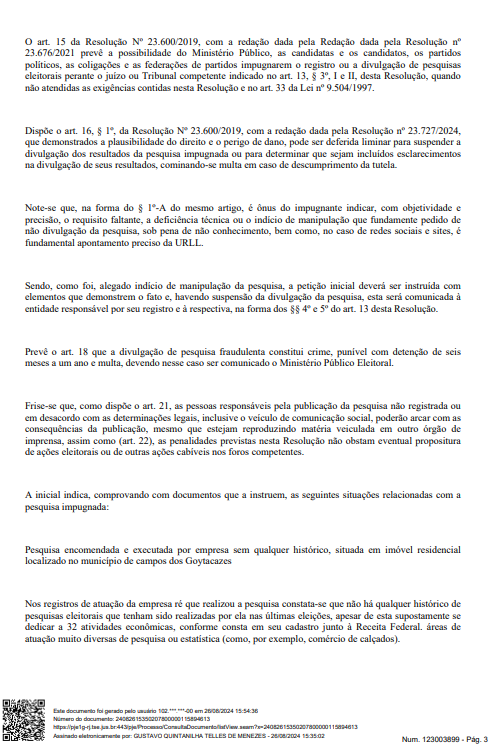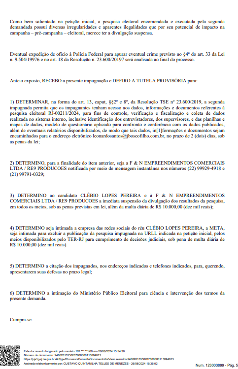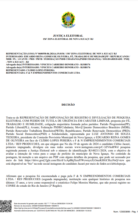 A liminar foi concedida pelo juiz Gustavo Quintanilha Telles de Menezes, da 156ª Zona Eleitoral de Nova Iguaçu, após o advogado Leonardo Santos Martins entrar com representação de impugnação de registro e divulgação da pesquisa (processo nº 0600550-86.2024.6.19.0156).
