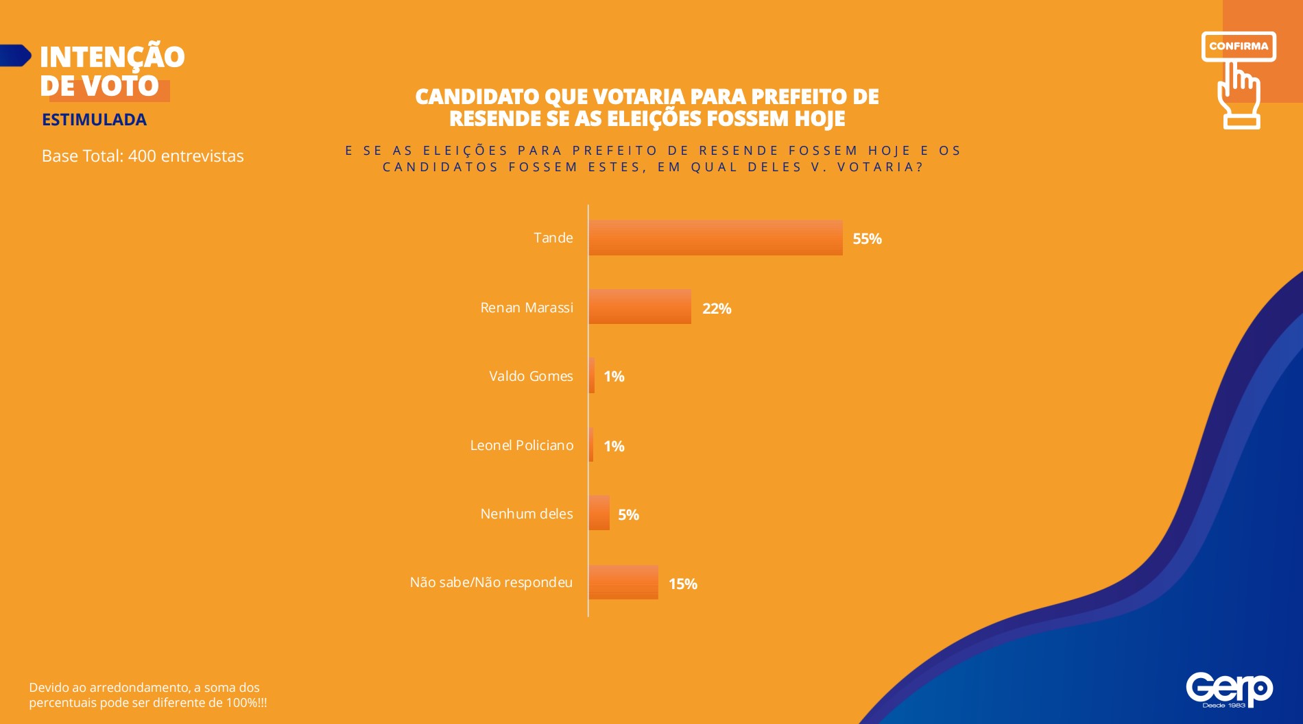 Pesquisa GERP divulgada na manhã desta quarta-feira (11/9) mostra Tande (PP) na liderança das intenções de voto para prefeito de Resende, confirmando levantamentos anteriores feitos no município pelo Instituto Prefab Future. De acordo com o GERP, na pesquisa induzida, em que o eleitor recebe um cartão com o nome dos candidatos, Tande tem 55% dos votos, contra 22% de Renan Marassi. Valdo Gomes tem 1% e Leonel Policiano, 1%. Nenhum, 5% e não sabe e não respondeu, 15%. A pesquisa foi encomendada pelo jornal Última Hora.