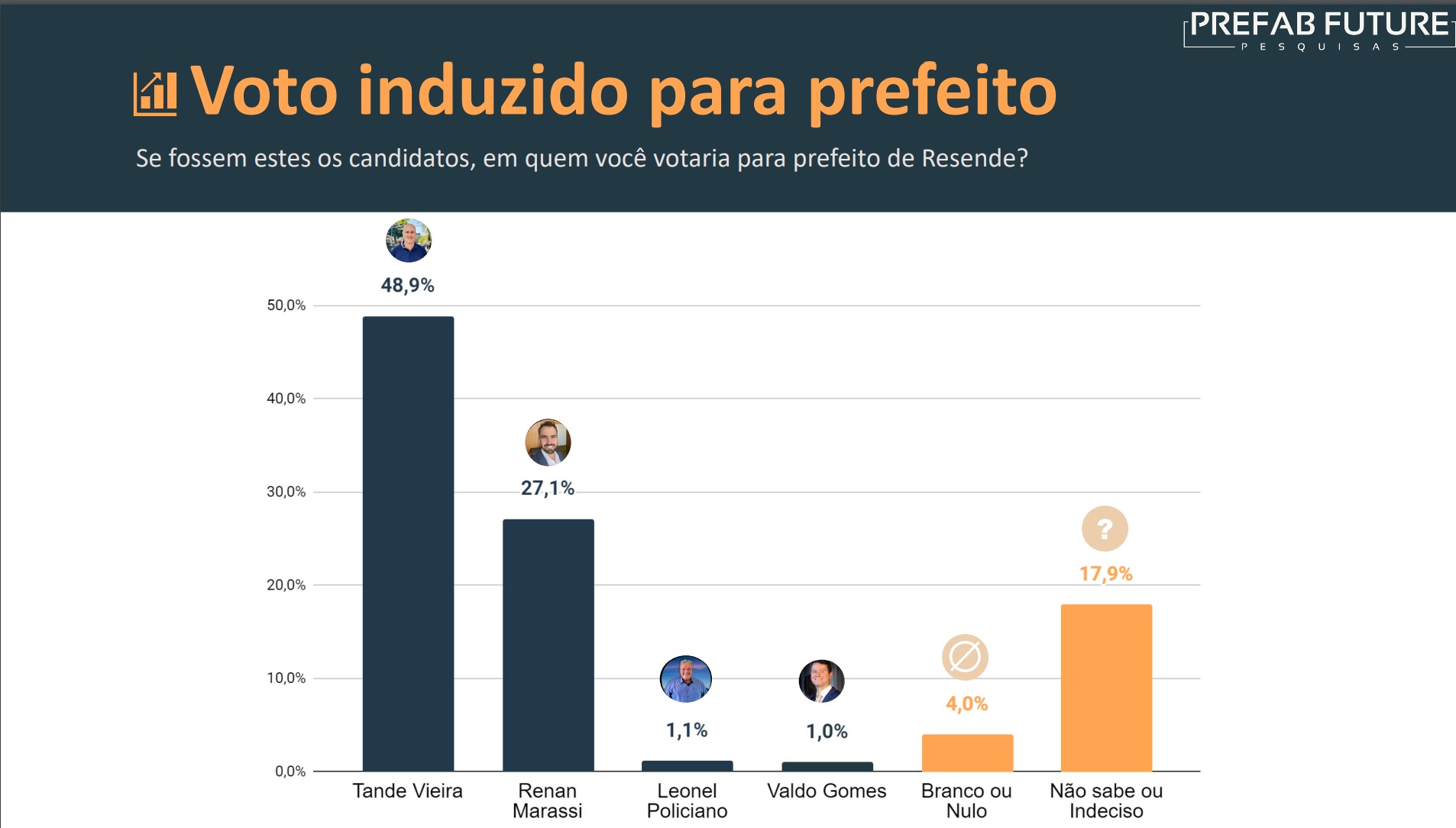 Na espontânea, em que o eleitor é perguntado se já tem candidato a prefeito mas não é apresentado à cartela com as opções, Tande mantém a liderança, com 46%, contra 18% de Renan Marassi. Na do Prefab, que escutou 804 eleitores, o resultado é de 41,3% contra 18,5%.