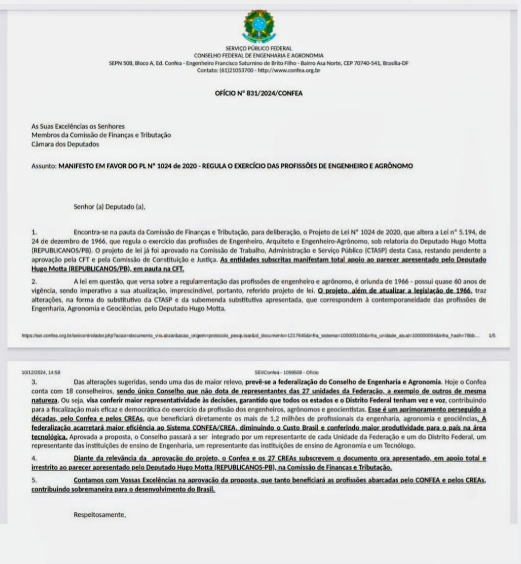 Está tramitando na CCJ - Comissão de Comissão e Justiça o projeto de Lei 1.024/20, que altera a Lei 5.194/66, que regula a profissão de Engenheiro. A presidência da comissão é do Deputado Paulo Azi (UNIÃO/BA), e o relator é o Deputado Cleber Verde (MDB/MA).