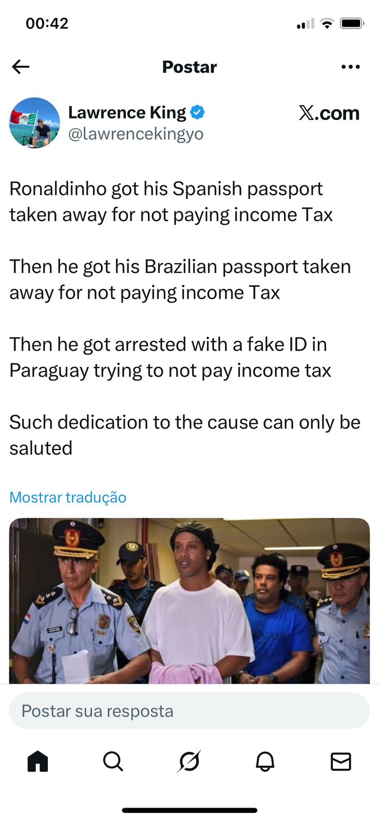 Era quase uma da manhã. Eu já tinha decidido dormir quando, no automático, abri o X, o antigo Twitter, “só para ver as últimas”. Entre um post e outro, apareceu a piada de um estrangeiro sobre Ronaldinho Gaúcho: passaporte espanhol tomado, passaporte brasileiro tomado, prisão no Paraguai com documento falso – tudo costurado pela ironia de que ele teria “dedicação exemplar” a não pagar imposto de renda.