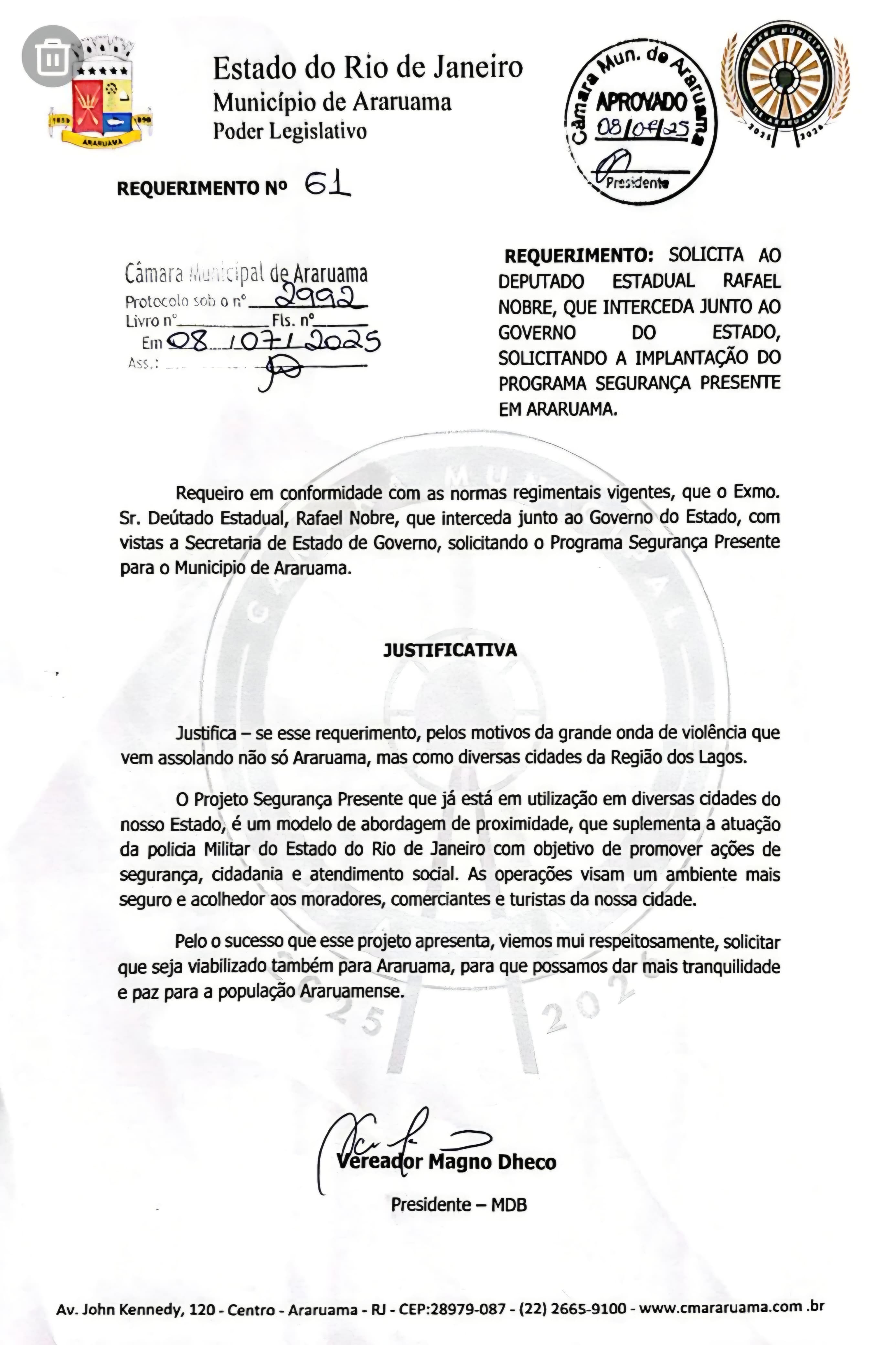 Na justificativa do requerimento, Magno Dheco destaca a crescente onda de violência que tem atingido não apenas Araruama, mas também outras cidades da Região dos Lagos. Ele aponta o programa Segurança Presente como um modelo bem-sucedido de policiamento de proximidade, já adotado em diversos municípios fluminenses.