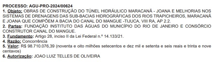 Além da construção do Túnel Hidráulico do Maracanã, a licitação pressupôs melhorias nos sistemas de drenagem das sub-bacias hidrográficas dos rios Trapicheiros, Maracanã e Joana, que compõem a Bacia do Canal do Mangue-Tijuca. O prazo para execução é de 750 dias.