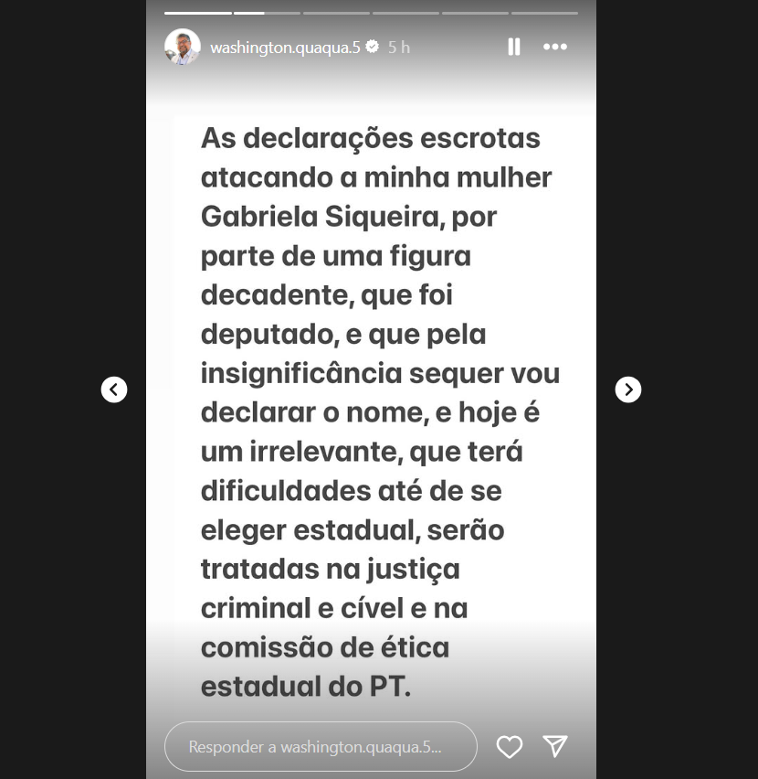 Em resposta às críticas recebidas, Quaquá manifestou "toda solidariedade à primeira-dama de Maricá", denunciando o que classificou como "atos cruéis de violência política de gênero".