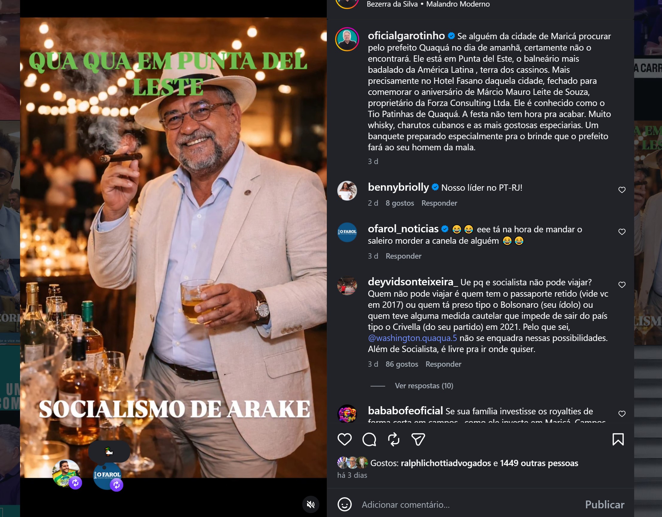 Mas, por trás de toda essa comédia política, há um lado bem sério. Quaquá não é apenas um prefeito que gosta de uma boa festa. Ele é um gestor que já foi condenado criminalmente em um caso anterior e que, atualmente, enfrenta diversas investigações por parte de órgãos como o Tribunal de Contas do Estado (TCE), o Ministério Público (MP) e a Polícia Federal (PF). É como se a festa em Punta del Este fosse apenas a ponta do iceberg de um mar de problemas. O vereador Netuno, por exemplo, já o acusou de corrupção, e essas denúncias, somadas às investigações em curso, pintam um quadro preocupante sobre a gestão de Maricá.