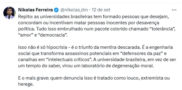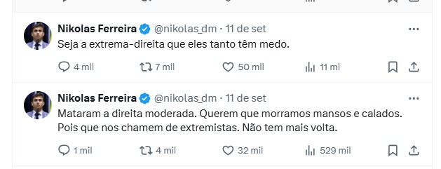 O novo ofício (nº 187/2025-P) reforça solicitação já encaminhada em 9 de setembro e destaca a gravidade dos fatos recentes revelados por reportagem da Folha de S.Paulo, publicada no dia 14. A matéria mostrou que grupos neonazistas brasileiros celebraram e apoiaram Nikolas Ferreira após um atentado contra o ativista norte-americano Charlie Kirk.