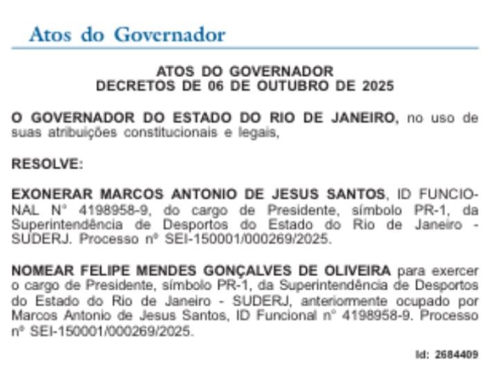 O governador Cláudio Castro promoveu uma mudança significativa na presidência da Superintendência de Desportos do Estado do Rio de Janeiro (Suderj) que vai muito além de uma simples troca administrativa. A exoneração de Marcos Antônio de Jesus Santos e a nomeação de Felipe Mendes Gonçalves de Oliveira, publicadas em edição extraordinária do Diário Oficial desta segunda-feira, representam um movimento estratégico que evidencia a reconfiguração das alianças políticas no Palácio Guanabara. A decisão sinaliza o fortalecimento do grupo político liderado pelo conselheiro do Tribunal de Contas do Estado, Thiago Pampolha, em detrimento da influência da família Otoni de Paula.