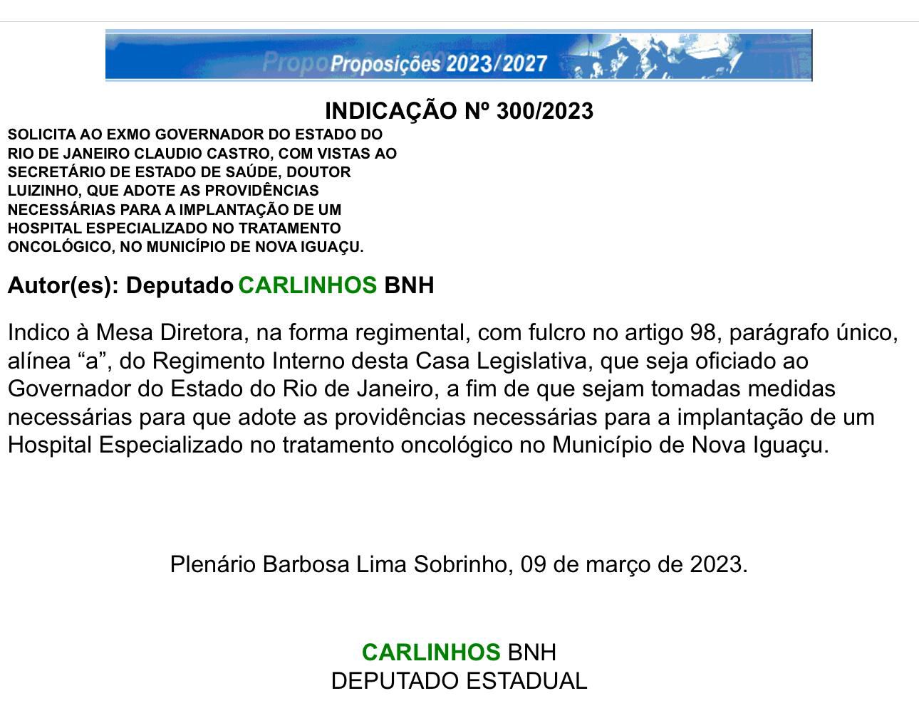 A visita é desdobramento da Indicação nº 300/2023, apresentada por Carlinhos BNH na Assembleia Legislativa do Estado do Rio de Janeiro (Alerj), que solicita a implantação de um hospital especializado no tratamento do câncer em Nova Iguaçu. Atualmente, milhares de pacientes da Baixada Fluminense precisam se deslocar para outras regiões em busca de tratamento oncológico.