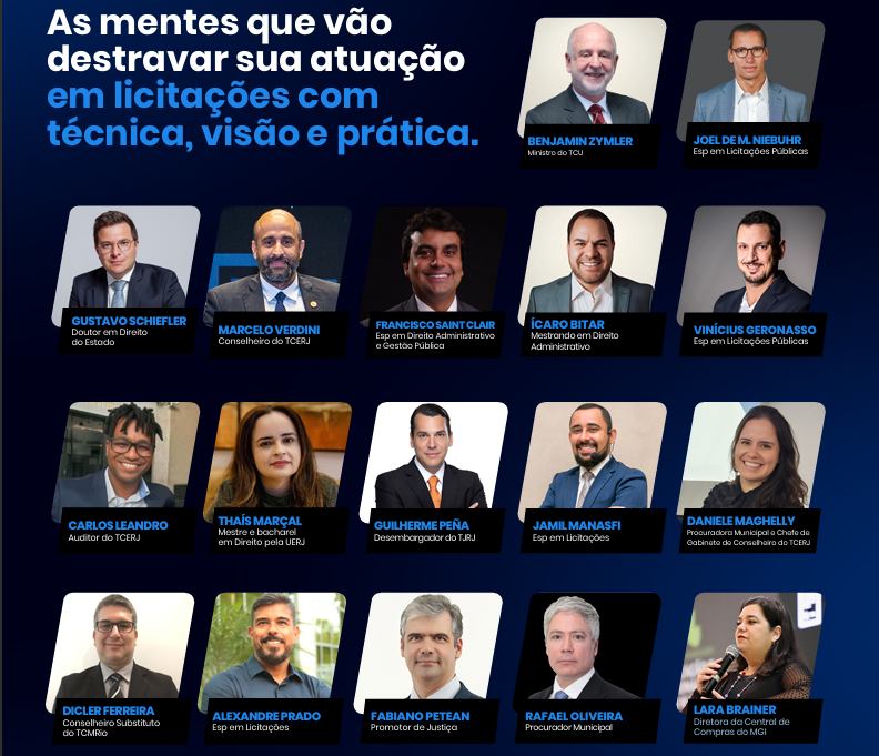 Reuniu-se um time de especialistas reconhecidos nacionalmente, entre eles: Benjamin Zymler, Joel de Menezes Niebuhr, Marcelo Verdini, Mônica Lopes, Lara Brainer, Vinicius Geronasso, Rafael de Oliveira, Werson Rêgo, Francisco Saint Clair, Ícaro Bitar, Thaís Marçal, Guilherme Peña, Wilson Celeiróz, Gustavo Schiefler, além de desembargadores, conselheiros, auditores e gestores públicos que estão na linha de frente das mudanças no setor.
