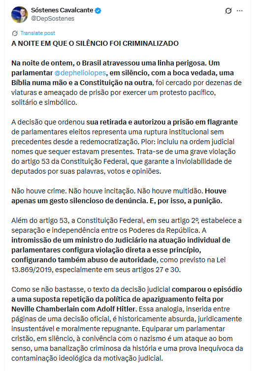 – Na noite de ontem, o Brasil atravessou uma linha perigosa. Um parlamentar, em silêncio, com a boca vedada, uma Bíblia numa mão e a Constituição na outra, foi cercado por dezenas de viaturas e ameaçado de prisão – declarou.
