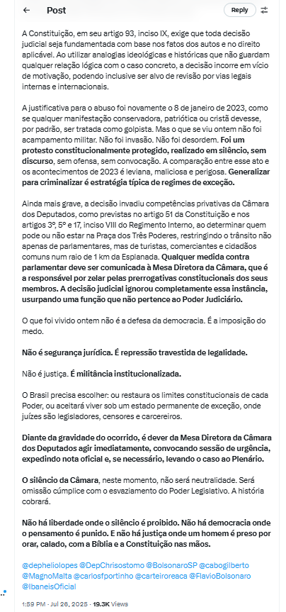 O líder do PL afirmou que a medida judicial viola o artigo 53 da Constituição, que garante a inviolabilidade de parlamentares por palavras, votos e opiniões. Ele destacou que “não houve crime, incitação ou desordem. Houve apenas um gesto silencioso de denúncia”.