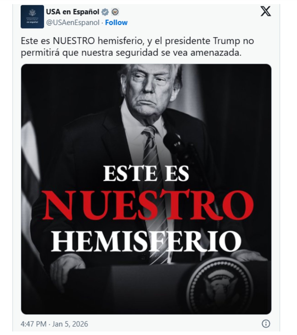 A recente declaração do governo americano — "Este é o NOSSO hemisfério" — transcende o campo da política externa tradicional e adentra território perigoso da propaganda autoritária. Com a palavra "nosso" destacada em vermelho sangue e acompanhada da imagem solene de Donald Trump, a Casa Branca não apenas comunica uma posição geopolítica, mas encena um espetáculo de poder que ecoa métodos historicamente associados aos regimes totalitários do século XX.