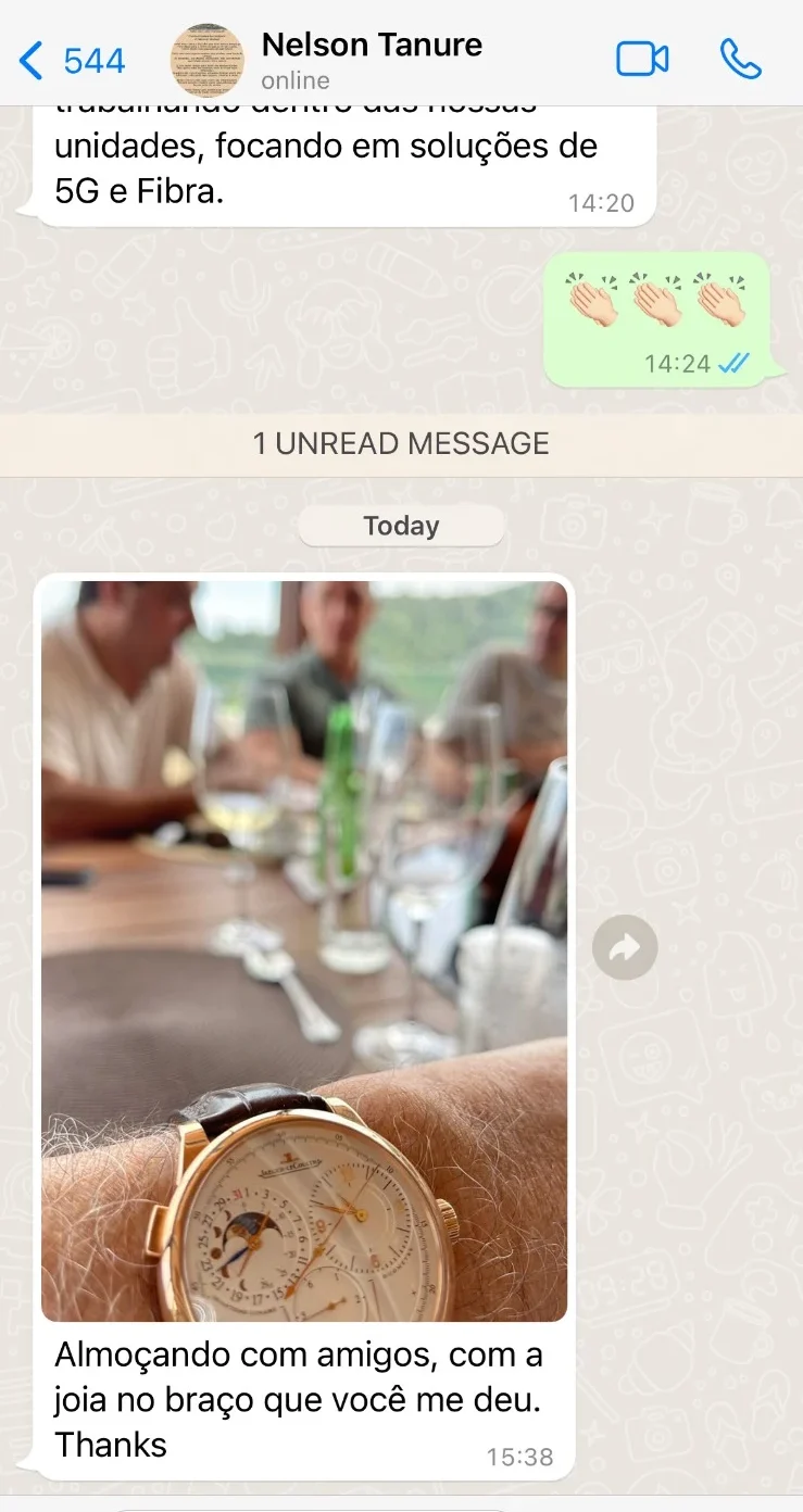 Na conversa, Tanure envia uma foto do relógio no próprio pulso e escreve: “Almoçando com amigos, com a joia no braço que você me deu. Thanks.”