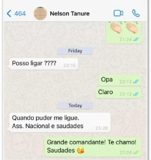 Na resposta, o banqueiro escreve: “Grande comandante! Te chamo! Saudades.” O tratamento revela uma relação de intimidade entre os dois empresários.