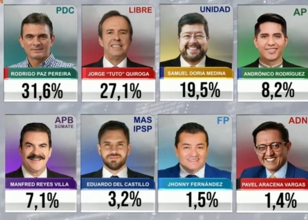 As pesquisas apontavam, até os últimos dias, uma superioridade eleitoral para o candidato Samuel Doria Medina. Um empresário popular que adotou as características e até o slogan do argentino Millei: "Dólares em 100 dias, carajo". Porém, ele ficou fora da segunda volta, alcançando 19,5% dos votos válidos.
